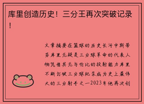文章摘要:在篮球的历史长河中,斯蒂芬·库里无疑是三分球革命的代表人物。凭借其无与伦比的投射能力,库里不断打破三分球纪录,成为史上最伟大的三分射手之一。2023年,他再次创造历史,打破了自己的三分球纪录...