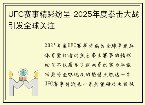 2025年度UFC赛事将成为全球拳迷和体育爱好者的焦点,拳击赛事的精彩纷呈不仅展示了运动员的实力和技巧,更将全球观众的热情点燃。这一年,UFC赛事将迎来一系列重磅对决,顶级拳击手将带来前所未有的震撼比...