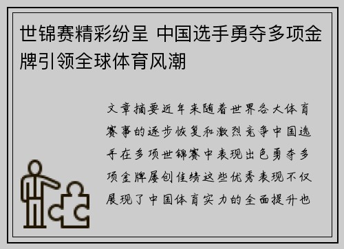 文章摘要:近年来,随着世界各大体育赛事的逐步恢复和激烈竞争,中国选手在多项世锦赛中表现出色,勇夺多项金牌,屡创佳绩。这些优秀表现不仅展现了中国体育实力的全面提升,也在全球体育舞台上树立了新的标杆。本文...