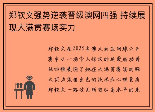 郑钦文在2025年澳大利亚网球公开赛中,以一场令人惊叹的逆袭成功晋级四强,展现了她在大满贯赛场的强大实力。凭借出色的技术和心理素质,郑钦文一路过关斩将,以高水平的表现击败了多位世界级选手,最终站上了四...