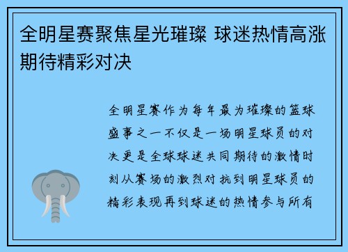 全明星赛,作为每年最为璀璨的篮球盛事之一,不仅是一场明星球员的对决,更是全球球迷共同期待的激情时刻。从赛场的激烈对抗到明星球员的精彩表现,再到球迷的热情参与,所有元素都让这场赛事成为了体育世界中的一大...