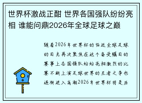 随着2026年世界杯的临近,全球足球的目光再次聚焦在这个备受瞩目的赛事上。各国强队纷纷亮相,激烈的比赛不断上演,足球世界的王者之争也逐渐进入高潮。2026年世界杯将是历史上规模最大的一届比赛,吸引了无...