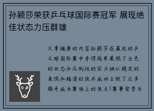 文章摘要的内容:孙颖莎在最近的乒乓球国际赛中夺得冠军,展现了出色的状态和压倒性的实力。她以稳定的表现和精湛的技术,成功击败了众多强手,成为赛场上的焦点。1、赛事背景与竞争对手孙颖莎荣获乒乓球国际赛冠军...